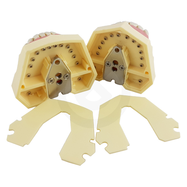 Modelos compatibles con la mayoría de los maniquís del mercado. También se pueden utilizar fuera del maniquí o con el Oclusor Metálico. Modelo para prácticas de Prótesis y Conservativa con 32 dientes extraduros simulando la dureza del diente humano, fijados con tornillo sobre una base con encía rígida integrada.