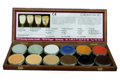 Útil para conocer la apreciada técnica del encerado en capas para reconstruir una corona en cerámica. Posibilidad de presentar una reconstrucción en cera conforme al modelo original. Gracias a su alto punto de solidificación la cera es apta para una prueba en la boca del paciente o para un revestimiento provisorio. CREATION SET con 12 ceras en los siguientes colores: esmeralda, gris, blanco transparente, azul transparente, amarillo, naranja, dentina, dentina clara, color cervical, marrón oscuro, marrón rojizo.