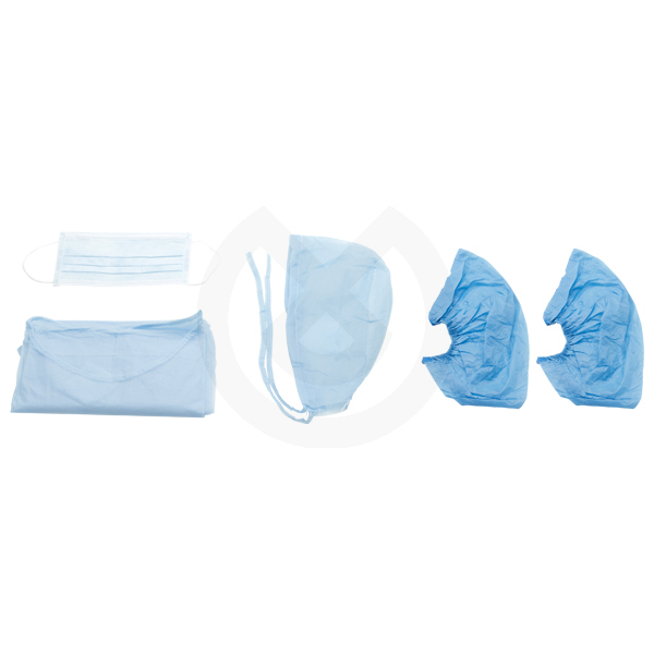 El set estéril para las intervenciones rutinarias. Set pensado especialmente para odontólogos, para intervenciones de corta duración. Bata hidrorrepelente con puños de algodón, gorro con lazo posterior, mascarilla Monoart® PTC 3, cubrezapatos impermeable