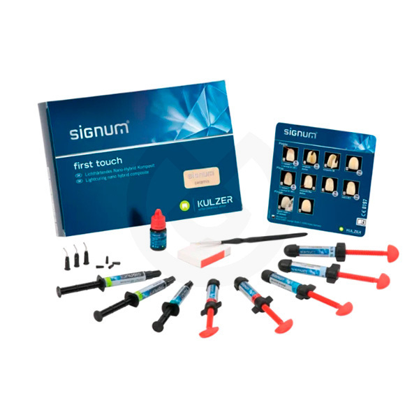 jeringa de 4 g de Signum ceramis DA2, DA3, EL, ET4 y ET5, jeringa de 3 g de Signum cré-active maroon y T1, jeringa de 4 g de Signum matrix OS2, 4 ml de Signum liquid, 20 cánulas y tapas, 1 bloque de mezcla, 1 pincel para colores y 1 ficha de trabajo.