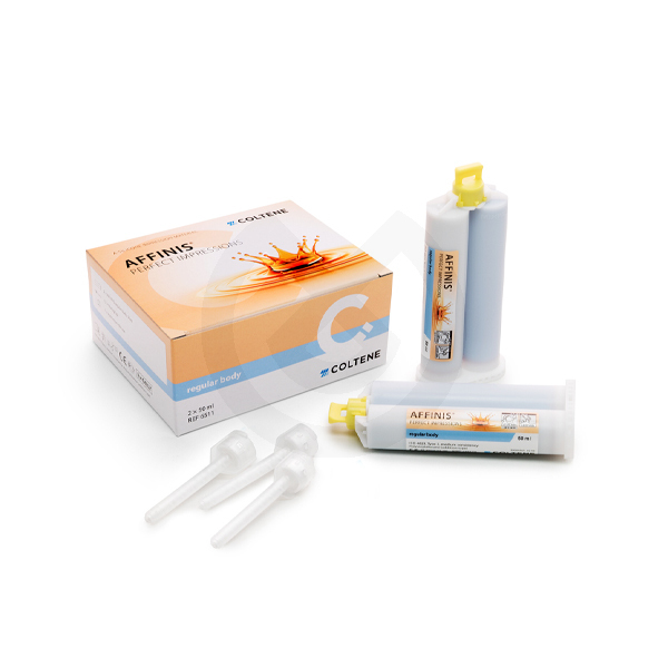 Las siliconas de impresión convencionales conducen a unos resultados insatisfactorios en condiciones clínicas de humedad debido una insuficiente fluidez y a una pobre afinidad con la superficie. El resultado es la aparición de poros por la incorporación de aire y distorsión marginal. Affinis es una silicona del tipo A pero con una afinidad a la superficie y unas propiedades ideales de viscosidad: - Su rápida y única afinidad con la estructura húmeda lo hace fluir como un hidrocoloide alcanzando las zonas más críticas sin tener que ejercer ningún tipo de presión con el material de cubeta. - La especial combinación de aditivos ejerce una mínima barrera a la viscosidad (consistencia auto-adaptante) evitando atrapar el aire pero a la vez el material es suficientemente tixotrópico para evitar el goteo fuera de la preparación.