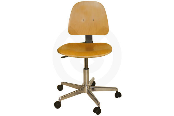 Silla de Laboratorio fabricada en madera y acero con ruedas. Regulable en altura y respaldo.