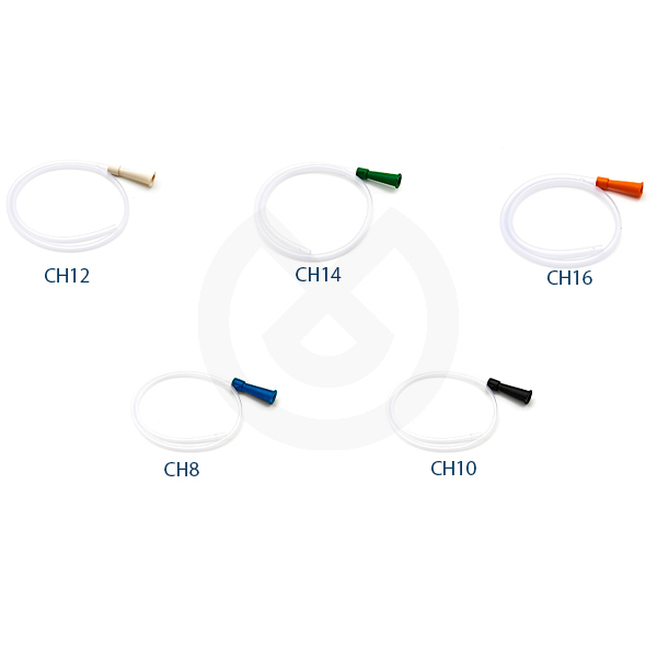 Sonda de aspiración en PVC, uso médico para la aspiración de esputos y secreciones del tracto respiratorio evitando su bloqueo. Punta atraumátuca abierta con dos orificios laterales. Conexión sin orificio de control de la aspiración. Se puede insertar directamente a través de la garganta o a través de tubo endotraqueal.