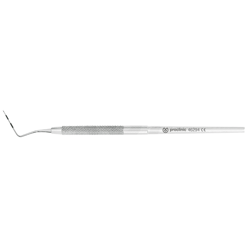 Sonda periodontal OMS, que en su extremo tiene una bolita de 0.5 mm. de diámetro, y en la porción central de su parte activa, una banda negra que indica calibración en dos longitudes: 3.5 mm en su inicio, y 5.5 mm. en su extremo distal.