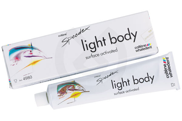 Speedex es la primera silicona de tipo C con un fraguado rápido y con características del tipo A. Una nueva fórmula llamada DCP, Dimension Controlling Precondensate, desarrollada exclusivamente por Coltene, le proporciona una gran elasticidad y estabilidad dimensional y al mismo tiempo precisión. A diferencia de las siliconas del tipo C las impresiones pueden vaciarse hasta siete días después de haber sido tomadas. En las siliconas convencionales del tipo C la contracción se produce por la evaporación de algunos productos, como el alcohol, durante el fraguado. La exclusiva fórmula de Speedex reduce considerablemente la pérdida de alcohol transfiriendo parte de la reacción de intercambio de ésteres a la fase de elaboración. Este procedimiento de Precondensación hace que las impresiones tomadas con Speedex mantengan su estabilidad dimensional durante días. Ahorro de tiempo: Tecnología termosensitiva. La fórmula de Speedex incorpora unos elementos termosensitivos que reaccionan rápidamente a la diferencia existente entre la temperatura ambiental y la de la boca. El resultado del fraguado casi instantáneo incrementará el confort del paciente, asegurando una impresión perfecta. Ud. podrá elegir el tiempo de fraguado que se adapte a su técnica mediante la cantidad de activador utilizado y Speedex le proporcionará un fraguado casi instantáneo. El activador de Speedex se usa tanto para el Putty como para el Light Body. Las moléculas tensioactivas de Speedex Light Body se trasladan hasta la superficie entrando en contacto con la humedad. Este proceso reduce el Ángulo de contacto resultando una reproducción más detallada tanto de la impresión como del modelo.