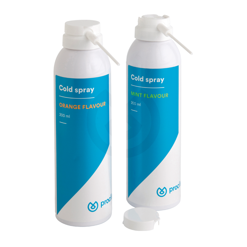 Spray refrigerante para test de vitalidad pulpar y enfriamiento de pellets, losetas de vidrio, etc. Disponible en dos fragancias agradables como la naranja y la menta, se aplica con precisión gracias a su aplicador especial que además permite ahorrar spray en cada aplicación. Enfría hasta - 35 º C.