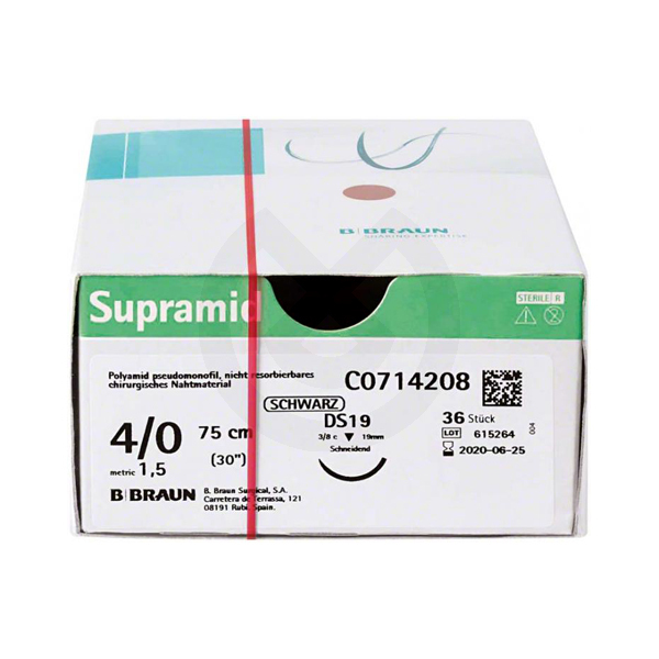Supramid es una sutura no absorbible pseudomonofilar de poliamida, dependiendo del calibre de la sutura. Los calibres USP 3 a USP 4/0 son pseudomonofilamentos con una parte central de poliamida 6.6 y una cubierta de poliamida 6 (de color negro o incolora). Los calibres USP 5/0 y USP 6/0 son una sutura monofilar de poliamida 6. Color negro. Largo del hilo: 75 cm.