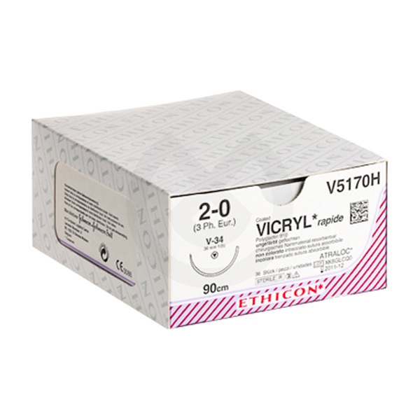 Sutura trenzada compuesta de copolímero de poliglactina 910 de bajo peso molecular y recubierta de poliglactina 370 (50%) y estearato cálcico (50%). Sutura absorbible (42 días) y con una fuerza tensil de 12 días. Esterilizada por irradiación. Color incoloro.