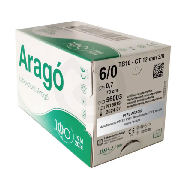 Suturas PTFE compuestas por 100% politetrafluoroetileno (teflón) monofilamento no absorbible con aguja triangular 'Reverse cut', hilo incoloro de 75 cm de largo. Esterilizadas por óxido de etileno.