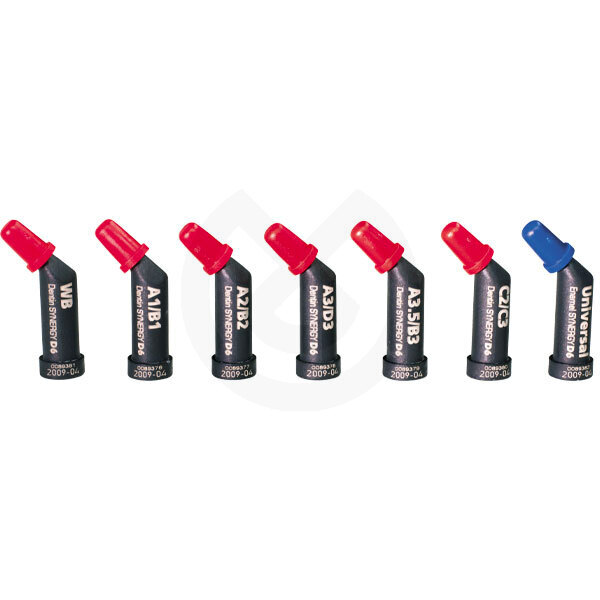 Composite anteriores con nueva formulación de su relleno Nano Híbrido inorgánico; con partículas pre-polimerizadas y una nueva generación de partículas Opalescentes. El profesional elige fácilmente la técnica estética de reconstrucción: Técnica Monocromática, (ó convencional). Con la guía de colores hecha con el mismo composite, elige 1 tono entre las 6 tonalidades Dentin Vita. Duo Shade (= 12 colores) y reconstruye en bloque. Técnica de Estratificación Simplificada, (2 tonos) elige con la guía de colores hecha con el mismo composite, 1 tono entre las 6 tonalidades Dentin . Vita Duo Shade (= 12 colores) y 1 tono entre las tonalidades de Esmaltes, Universal ó White Opalescente y reconstruye estratificando. La exclusiva guía de colores de Synergy D6 permite superponer las dos tonalidades de composite seleccionadas y así comprobar la combinación cromática con toda confianza sobre el resultado final. - Manipulación excelente, es suave en anteriores pero con la suficiente firmeza para condensarlo en posteriores. - No se pega. - Mantiene la forma anatómica hasta la foto-polimerización, no se derrumba. - Posibilita hacer buenos puntos de contacto. - Baja contracción de polimerización. - Rápido y Excelente pulido. - Efecto Opalescente natural. - Restauraciones invisibles.