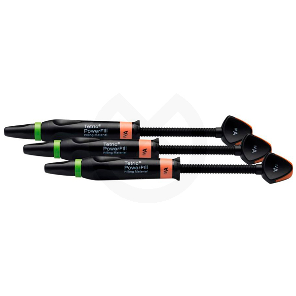 Tetric® PowerFill es el nuevo composite tipo bulk fill que se puede fotopolimerizar en tan sólo 3 segundos en combinación con la lámpara LED Bluephase PowerCure. Se aplica en capas de hasta 4 mm y se fotopolimeriza en un intervalo de longitud de onda de 400 a 500 nm. Contiene en su composición un mitigador de estrés de contracción más fuerte que el bulk fill convencional. Indicado para restauraciones directas en clases I y II en las que el profesional fotopolimeriza por oclusal. El sistema completo incluye la luz de alto rendimiento Bluephase PowerCure, que permite fotopolimerizar Tetric Powerfill y Tetric PowerFlow en tan sólo 3 segundos.