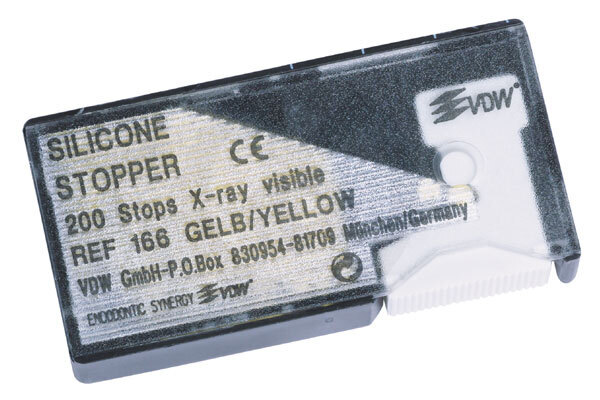 Topes de color amarillo presentados en caja distribuidora con regla de endodoncia.
