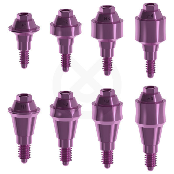 Aditamento mecanizado que, fijado directamente al implante, realiza la función principal de actuar como elemento intermedio entre el implante y la prótesis. La existencia en varias alturas, 1.0 mm, 2.0 mm, 3.0 mm y 4.0 mm en pilares rectos y 3.0 mm y 5.0 mm en angulados, permiten elevar el plano de asentamiento de la prótesis cuando existe un grosor de tejido blando que no es adecuado para realizar una conexión directa a implante.