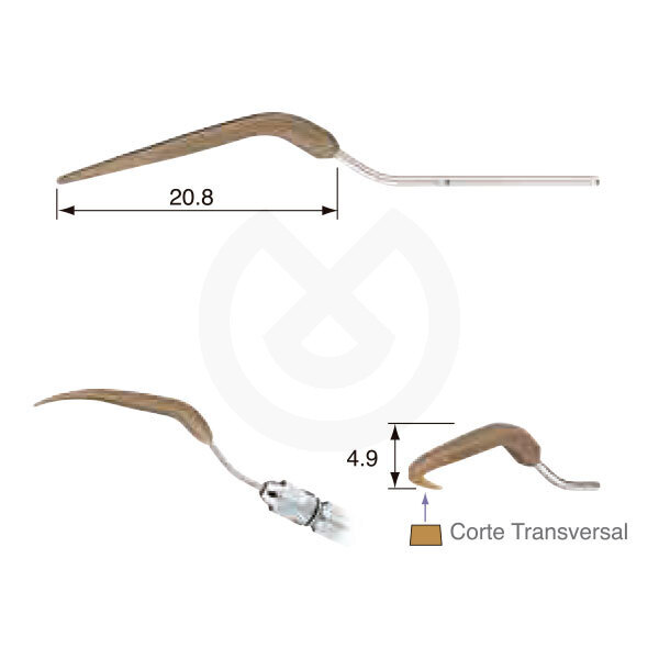 Los modelos V-P11R/L derecha e izquierda son puntas con doble curva. Estas puntas son extralargas para facilitar el acceso a zonas difíciles y evitar interferencias con los dientes adyacentes o los contornos. Su forma ha sido diseñada para adaptarse perfectamente a las diferentes morfologías dentarias, lo que las hace extremadamente versátiles para una amplia gama de aplicaciones en dientes anteriores y premolares.