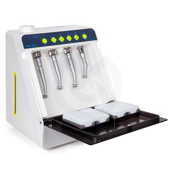 El dispositivo VELOCARE 3-1 es una máquina de lubricación de instrumental rotatorio de Odontología con entradas para tres turbinas y un contra ángulo, que combina funcionalidad y diseño en un cuerpo compacto y sofisticado. Su facilidad de uso y sus múltiples funciones garantizan una limpieza y lubricación completas de su instrumental.