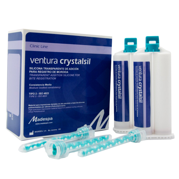 Ventura Crystalsil es una silicona de adición transparente especialmente formulada para la confección de matrices y registros de alta precisión. Su composición proporciona una fluidez óptima y un elevado grado de transparencia, lo que permite visualizar con claridad el composite fotopolimerizable durante el proceso de restauración estética.