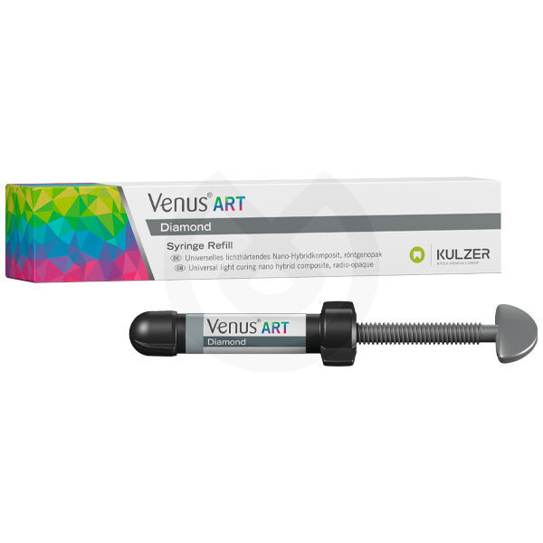 Las nuevas clases de restauraciones perfectas: Venus Diamond es un nuevo composite universal nano-híbrido que combina en un solo producto una baja contracción y una elevada dureza. Se obtienen excelentes resultados aplicando una única capa de Venus Diamond en restauraciones de casos más complejos. Este material puede adaptarse de una manera única al color de la estructura dental contigua dando un aspecto extraordinariamente natural. Colores Universales: para resultados extremamente estéticos. Los tonos universales poseen intensidades de color de translucidez media y están disponibles en una amplia gama de colores. Pueden usarse con o sin capeado adicional y combinarse con dentina y/o con los incisales.