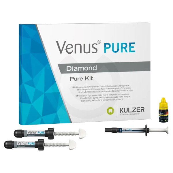 2 jeringas de 4 g de Venus Diamond Pure Shades (1 de cada color: LIGHT + MEDIUM) + 1 jeringa de 2 g Venus Bulk Flow ONE + 1 botella de 2 ml iBOND Universal + 5 puntas para el composite Bulk Flow + tabla de equivalencias + tarjetón ilustrativo iBOND Universal + instrucciones de uso