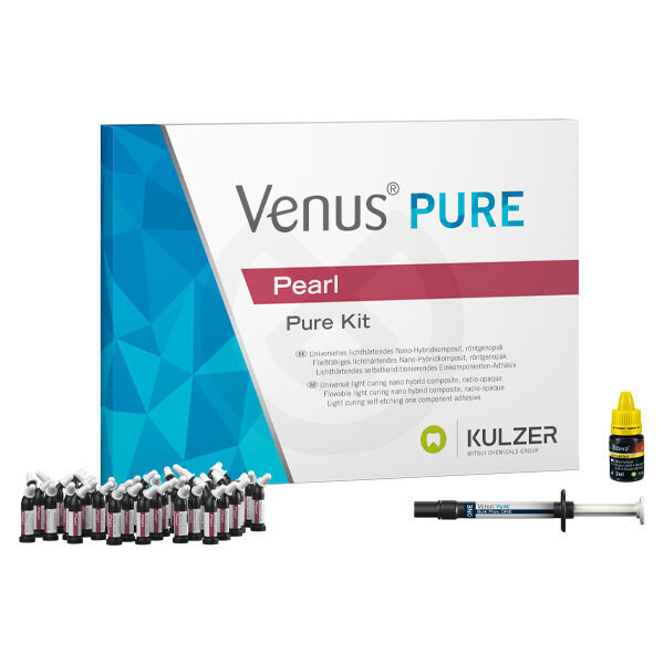 40 cápsulas de 0,20 g de Venus Pearl Pure Shades (20u. de cada color: LIGHT + MEDIUM) + 1 jeringa de 2 g Venus Bulk Flow ONE + 1 botella de 2 ml iBOND Universal + 5 puntas para Bulk Flow + tabla de equivalencias + tarjetón ilustrativo iBOND Universal + instrucciones de uso
