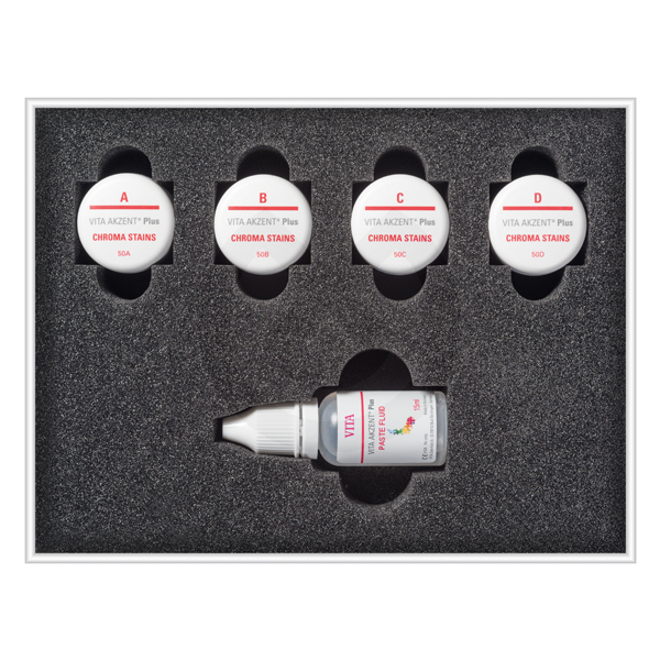 - 5 x Vita AKZENT Plus Chroma Stains 4g: Chroma L, R, IO, M2, M3.