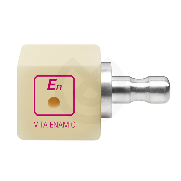 Cerámica híbrida dental con matriz dual. La matriz cerámica dominante (cerámica feldespática) es reforzada por una matriz polimérica de manera que se interlazan totalmente. Se garantiza una especial elasticidad y una enorme capacidad de carga tras la unión adhesiva. Tiene una gran absorción de las fuerzas masticatorias. Se pueden realizar grosores de pared reducidos. Propiedades físicas muy parecidas a los dientes naturales. Vita Enamic está especialmente indicada para reconstrucciones mínimamente invasivas, también en condiciones de espacio limitadas, y coronas de dientes posteriores.