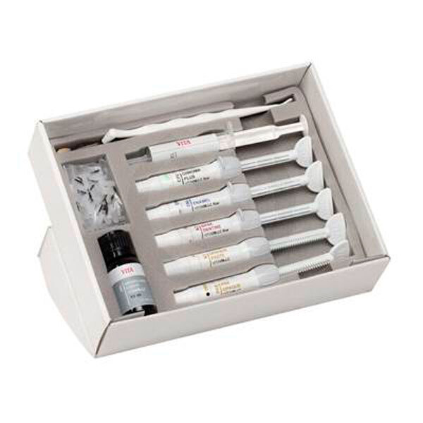 Contenido: 1 x 3 g VITA VM LC PRE OPAQUE PRE 1 x 3 g VITA VM LC OPAQUE PASTE A3 1 x 4 g VITA VM LC flow BASE DENTINE A3 1 x 4 g VITA VM LC flow ENAMEL ENL 1 x 5 ml VITA VM LC Gel 1 x 10 ml VITA VM LC MODELLING LIQUID 1 x 3 g VITA VM LC flow CHROMA PLUS CP2 1 Soporte para pinceles blanco 1 Puntas de pincel desechables, 50 uds. 1 Nº 1 Pincel de corrección de pelo de marta roja 1 VITA varilla de colores A3