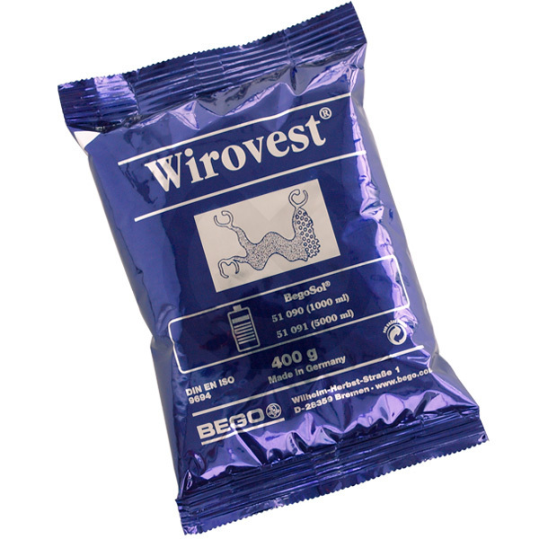 Revestimiento para la técnica de esqueléticos. Para duplicado con gelatina y silicona, con precalentamiento convencional. Wirovest se puede mezclar con agua para el vaciado el cilindro, lo que reduce considerablemente el gasto en líquidos especiales. Se utiliza con el líquido especial BegoSol.